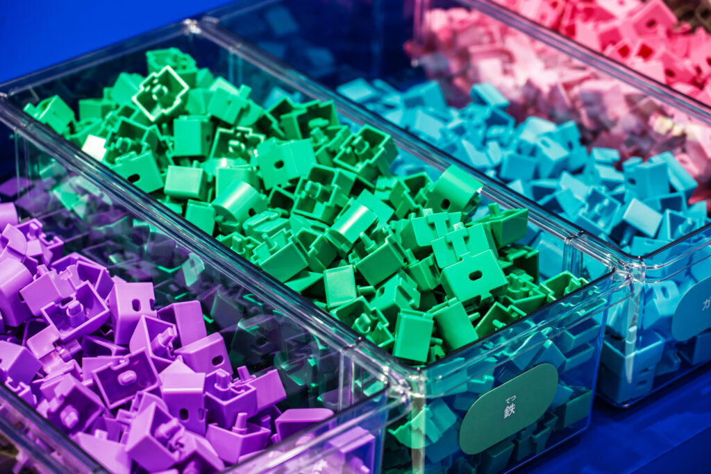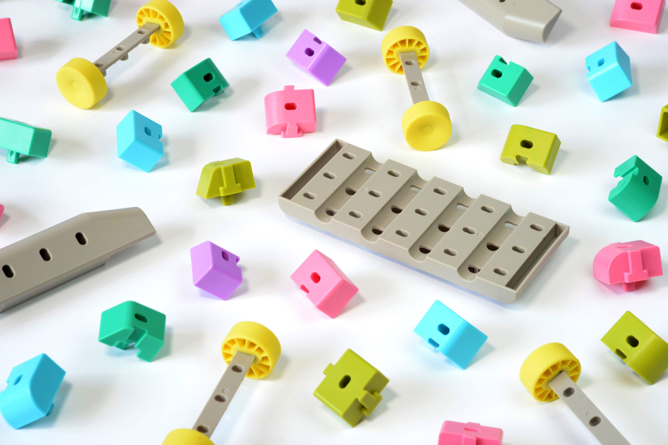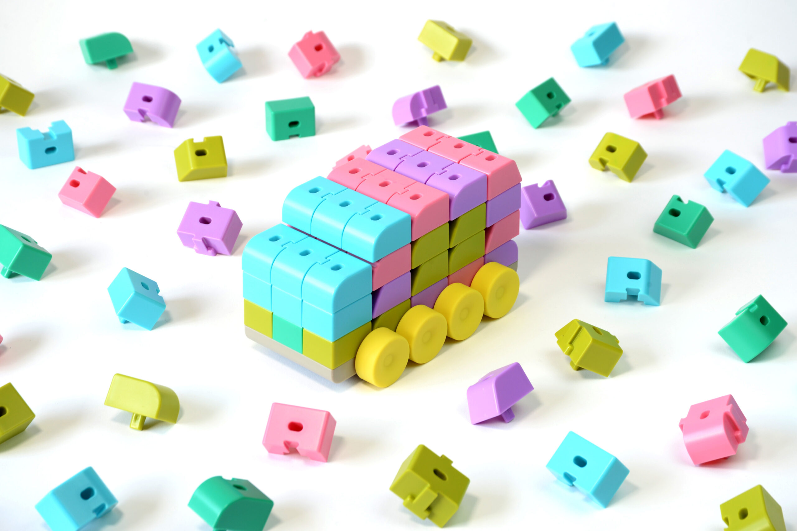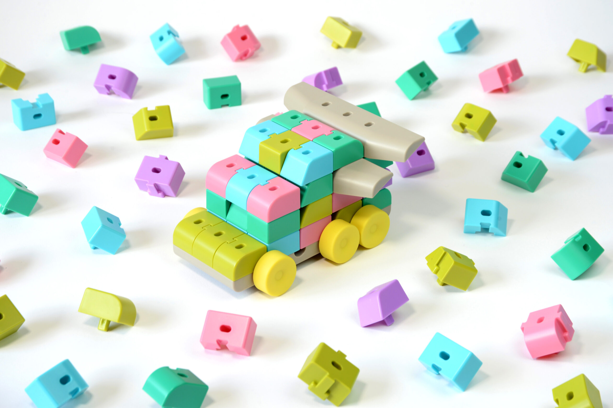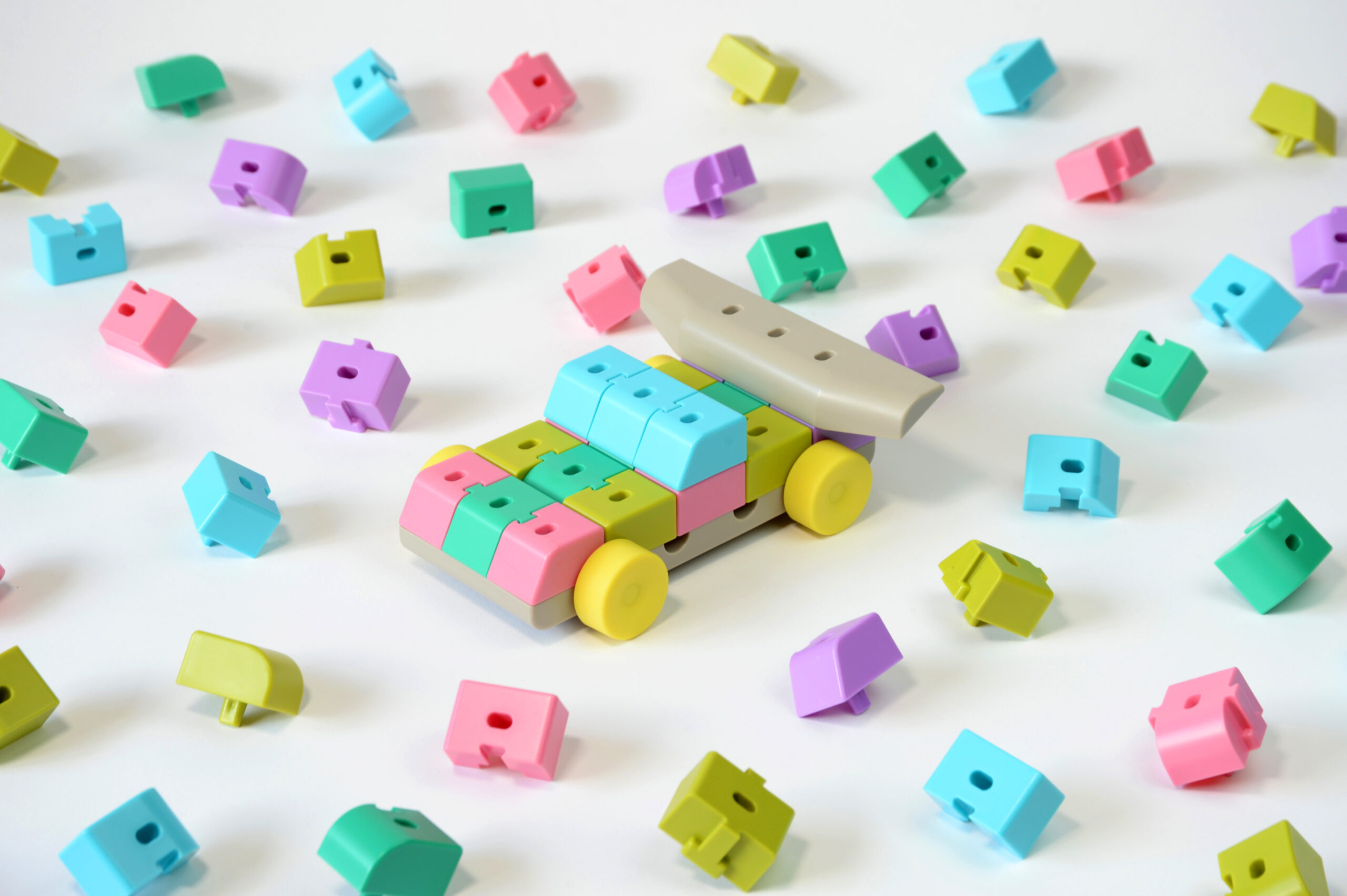 カラフルな色のブロックはそれぞれ車に使用される素材、鉄、アルミ、ガラス等々の素材を現していて、そのブロック同士を自由に組み合わせることで世界でたった一つの自分だけの車が完成。