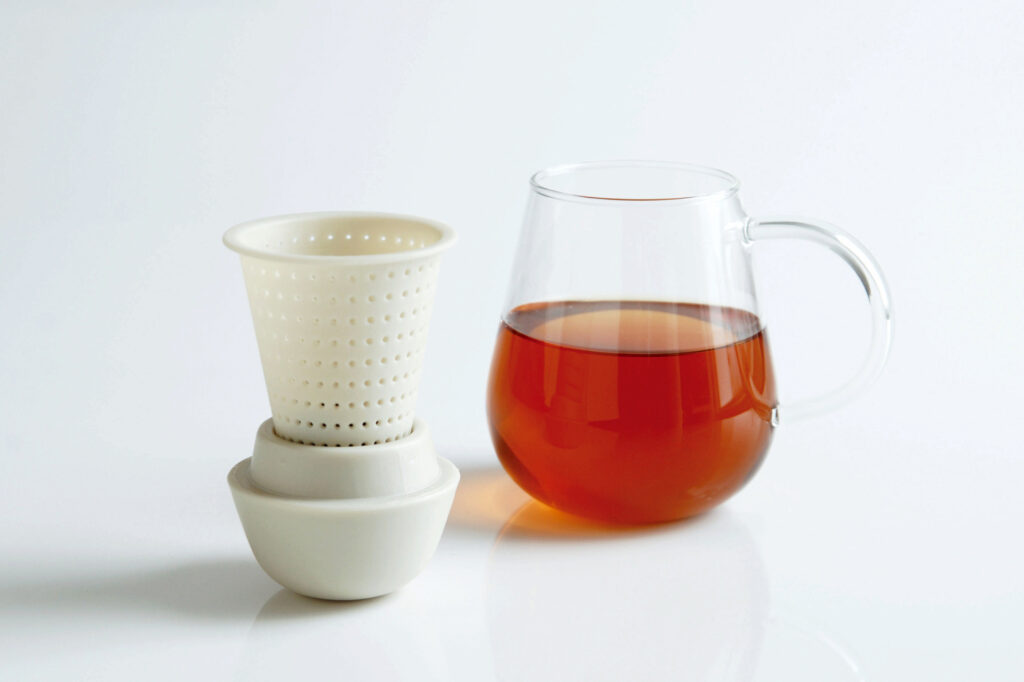 お茶を淹れたポットがそのままカップとして使える、ティーポット&カップをデザインしました。柔らかな裾広がりのフォルムは、心地よい温もり感を演出。カップの口径は上部に向かって狭くなっているのでお茶も冷めにくく安定感をキープ。カップの中に見えるストレイナーは蓋と一体感を持たせ、デザインのアクセントにしました。上部の蓋は裏返せば、お茶を飲む際のストレイナー置きとしても機能します。愛着のあるペンギンのような佇まいから「Pengy / ペンギー」と名付けました。